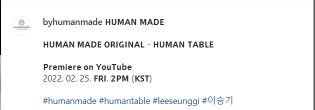 Tehát holnap, február 25-én magyar idő szerint reggel 6 órakor lesz a premiere a Human Made ügynökség, vagyis Lee Seung Gi első saját készítésű Youtube-videójának, amely a Human Table címet kapta. Ez az a videó, amelyről Lee Seung Gi a januárban írt üzenetében is szót ejtett. A videóban főszerepet kap Lee Seung Gi két nagy kedvence, a zene és a finom ételek, erre a megosztott képek is utalnak: